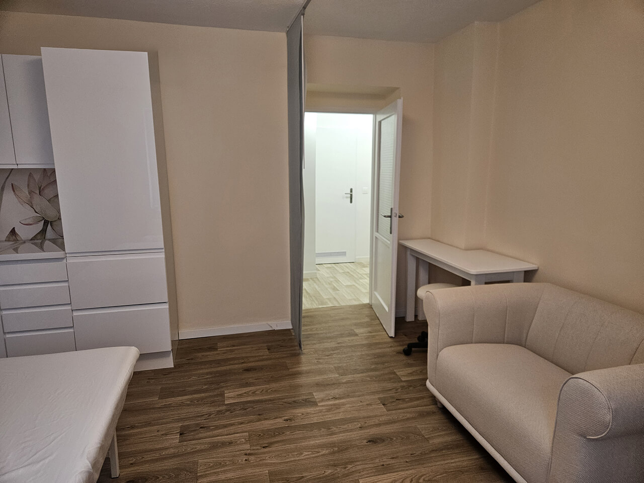 Největší důraz jsem věnovala akcentové stěně, která strhává veškerou pozornost po vstupu do místnosti. Zvolila jsem tapetu, která následně udává barevné schéma prostoru. Nábytek je tedy vybrán v neutrálních teplých tónech, sloužící danému účelu, ale bez výraznějších barevných kombinací.