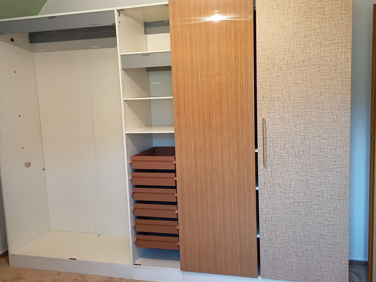 Barevné schéma jsem zvolila dle přání majitelky a s ohledem na nábytek, který byl v místnosti ponechán. Postel udávala celkový barevný tón, kterému jsem podřídila výběr koberce, nástěnné fototapety i volbu samolepící tapety na šatní skříně. Samolepící tapeta s motivem přírodní juty a úchytky dveří ve zlaté barvě, pomohli přidat pomyslnou texturu, kterou nebylo možno z finančních důvodu vyměnit za skutečné. Pro podlahovou krytinu jsem zvolila koberec extra měkký s filcovou podložkou, pro hřejivý a měkký pocit.